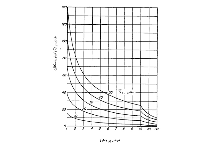 برای محاسبه ظرفیت باربری مجاز پی های گسترده ، مقادیر Q حاصل از شکل قبل دو برابر در نظر گرفته شود.