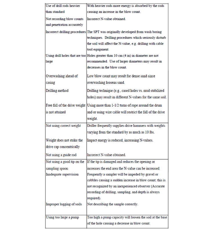 تمیز نبودن مناسب گمانه: SPT باید درخاکهای بکر اندازه کیری شود. لجن ممکن است وارد نمونه گیر شده و باعث افزایشN شود که می توان این را با استفاده از پوشش نمونه گیر اصلاح کرد.